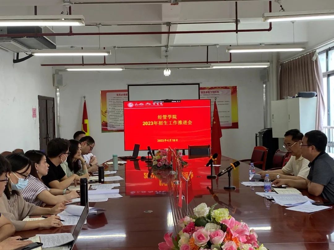 4月18日上午,经管学院在行政楼B606会议室召开2023年招生工作推进会,学院院长刘恩专、院长助理、各系主任和办公室负责同志参加会议。分党委书记、副院长吴培煌主持会议。