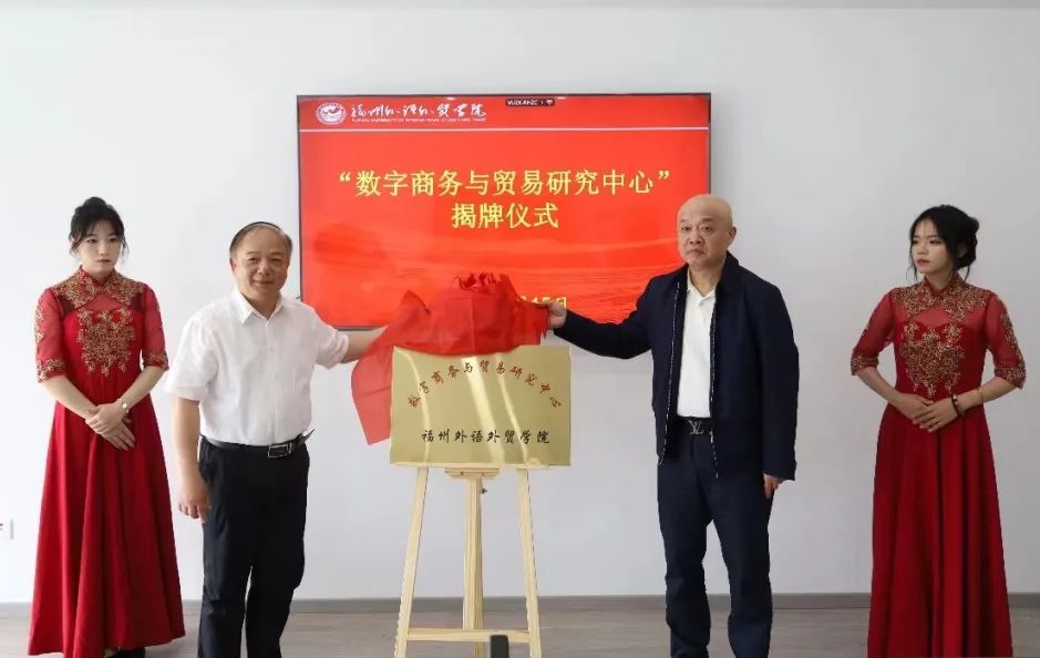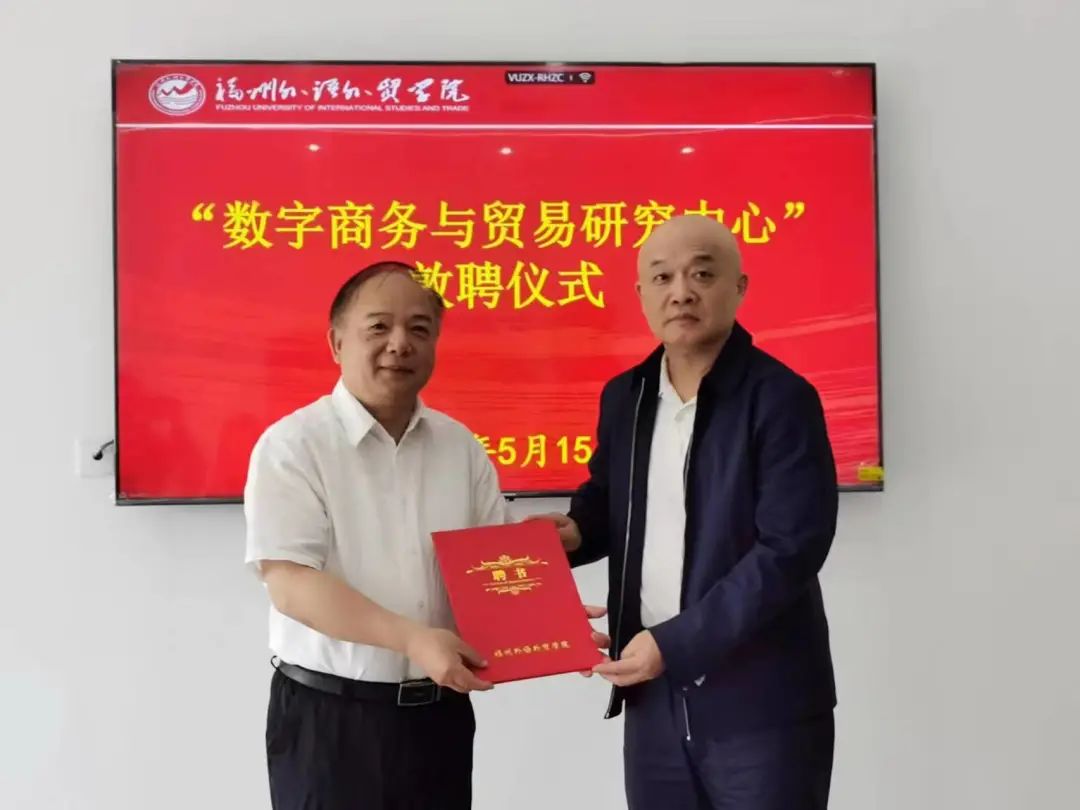 成立大会上,黄建忠教授和许明校长共同为“数字商务与贸易研究中心”新型智库揭牌,许明校长为黄建忠教授颁发聘书并佩戴校徽。