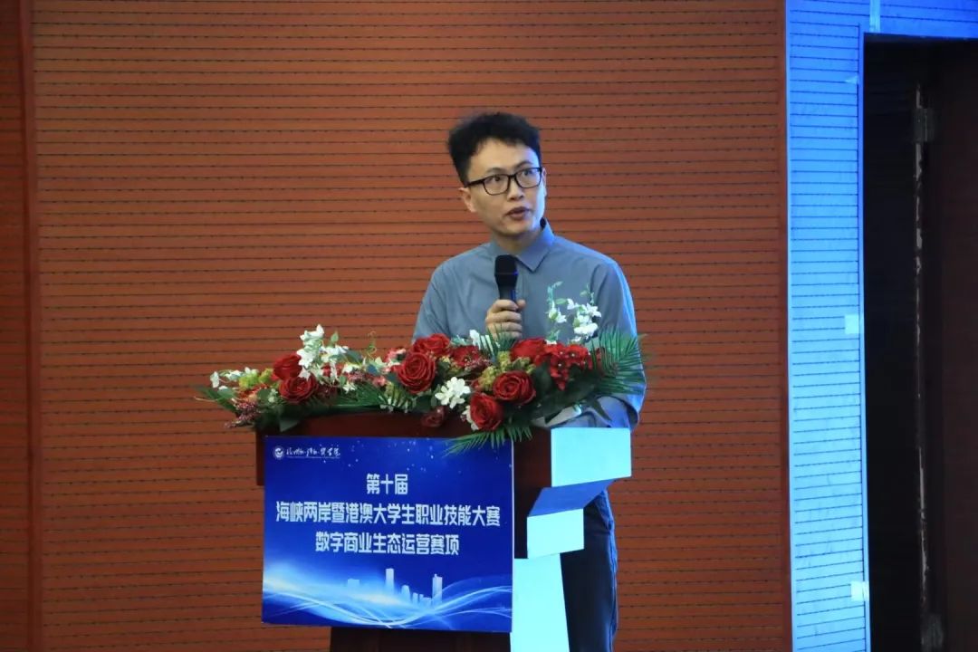 最后,第十届海峡两岸暨港澳大学生职业技能大赛“数字商业生态运营”赛项裁判长胡永仕教授进行发言,他表示将文明裁判,严肃认真,不循私情,秉公办事,圆满完成各项裁判⼯作。