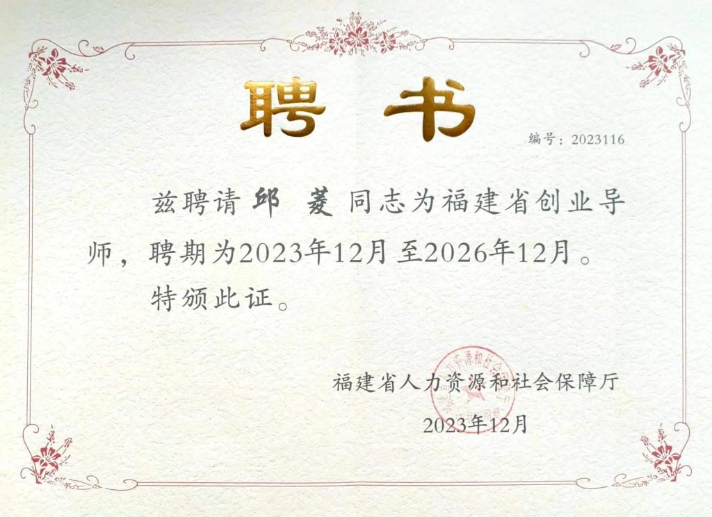 邱菱副教授受聘福州市人力资源与社会保障局创新创业导师、福建省人社厅第一批职业技能培训师(互联网营销师)、2023年首届国家级创新创业学院数字乡村专创融合认证师资;