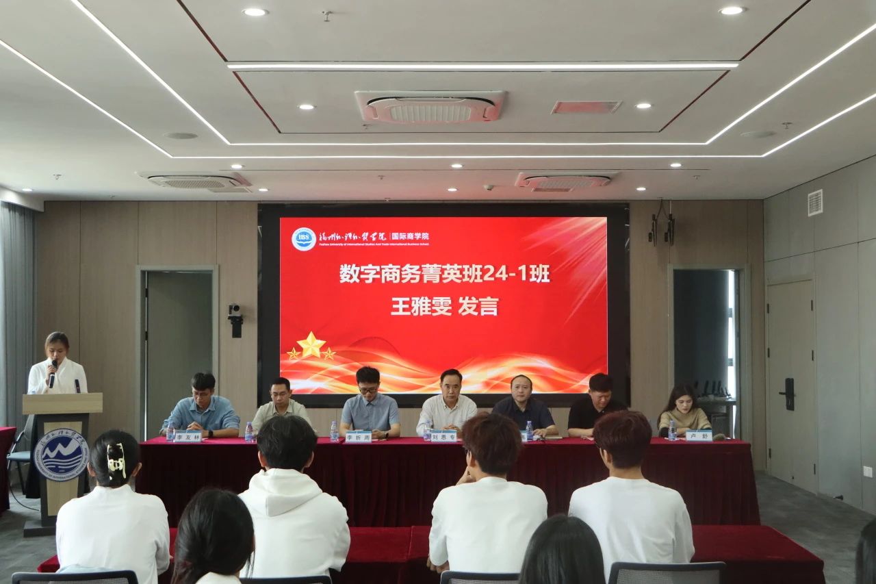 紧接着由老生代表朱怡倩同学发言,她分享了自己在菁英班一年以来的学习历程,鼓励同学们去探索和参与丰富多彩的课程和活动,不断完善自己、提升自己,展现出独特的风采,在数字商务的海洋中乘风破浪,共同创造美好未来。