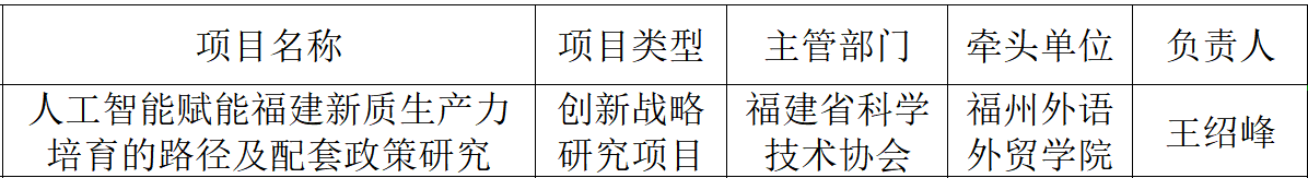 近日,福建省科学技术厅 福建省科学技术协会公布了2024年福建省创新战略研究联合项目计划(闽科政〔2024〕2号),我院教师王绍峰教授申报《人工智能赋能福建新质生产力培育的路径及配套政策研究》项目入选2024年福建省创新战略研究联合项目计划,项目资助经费5万元,总投资10万元