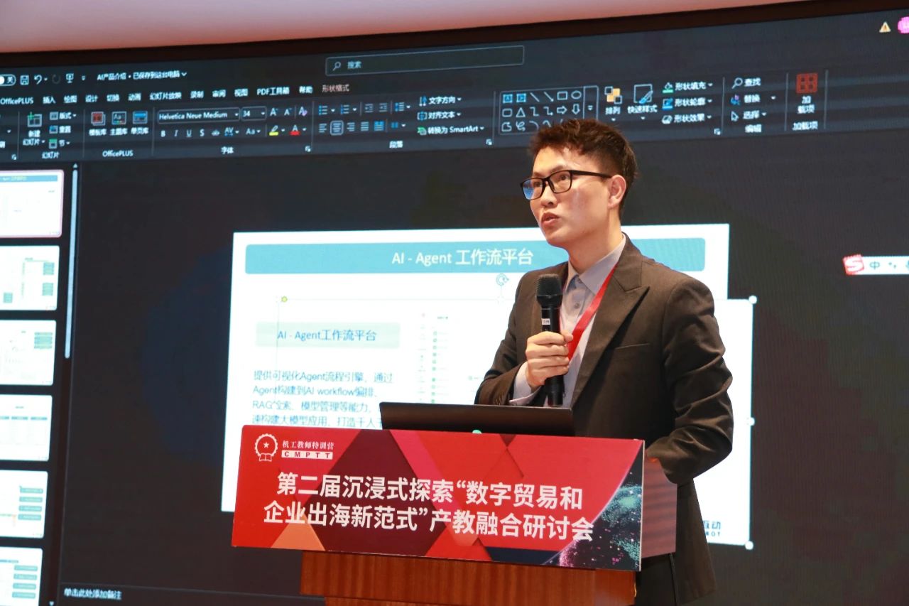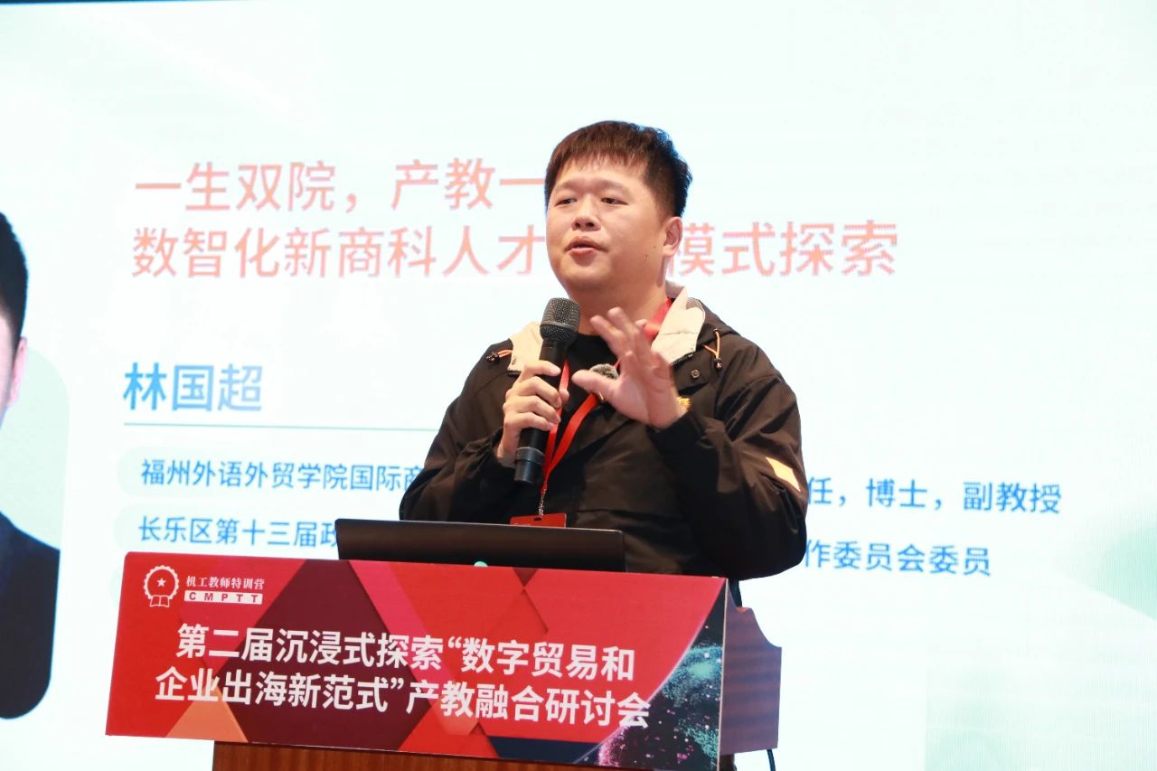 福州外语外贸学院国际商学院院长助理林国超作“一生双院,产教一向:数智化新商科人才培养模式探索”主旨演讲