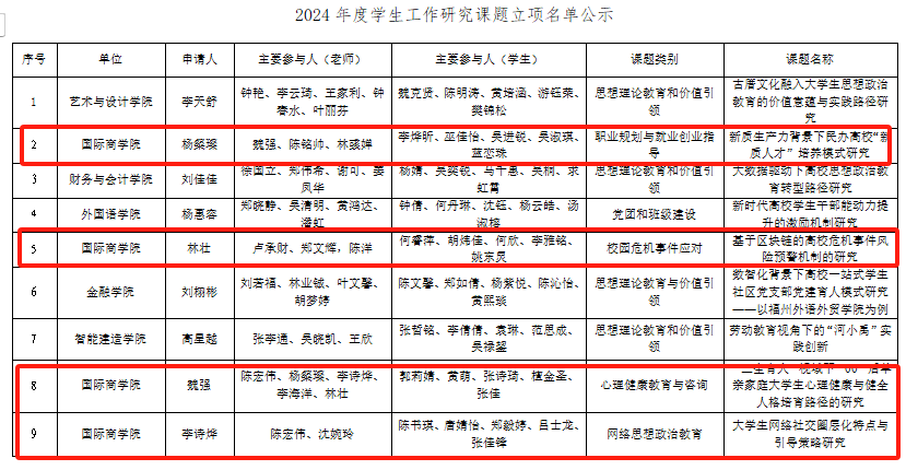 2024年,学院高级别项目再次实现突破,黄丽华老师《东南沿海典型湿地生态系统的碳汇贸易价值实现路径研究》获批国家社会科学基金一般项目立项,《海峡两岸高新科技产业融合及韧性提升策略研究 》获中国科协项目立项,王绍峰老师《生成式人工智能驱动专精特新“小巨人”企业国际竞争力提升机制及对策研究》获教育部人文社会科学一般项目立项,《人工智能时代政府统计调查方法的改革研究》获国家统计局全国统计科学研究项目优选项目立项;另外获批福建省社会科学基金重大项目1项,福建省社会科学基金一般项目1项,科技厅创新联合项目1项,科技厅项目3项,“数字商务与产业融合发展研究中心”福州市重点研究基地项目8项。