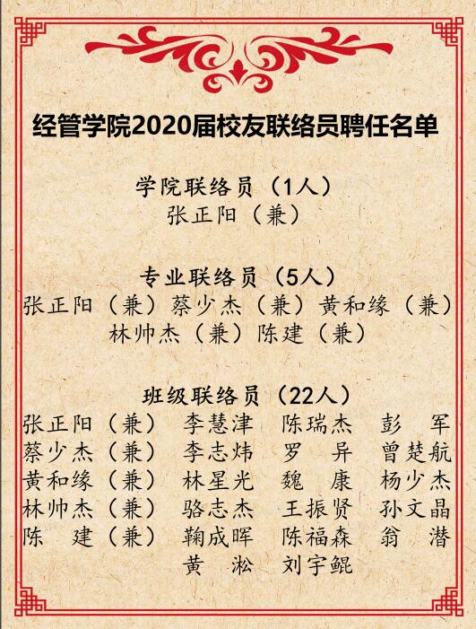 为了增进校友与学校之间以及校友之间的交流与沟通,保持我校毕业生与学校的密切联系,促进校友和学校事业的共同发展,加强我院与校友的情感共同体建设,经各班推荐,特此聘任经管学院22名同学为2020届校友联络员。