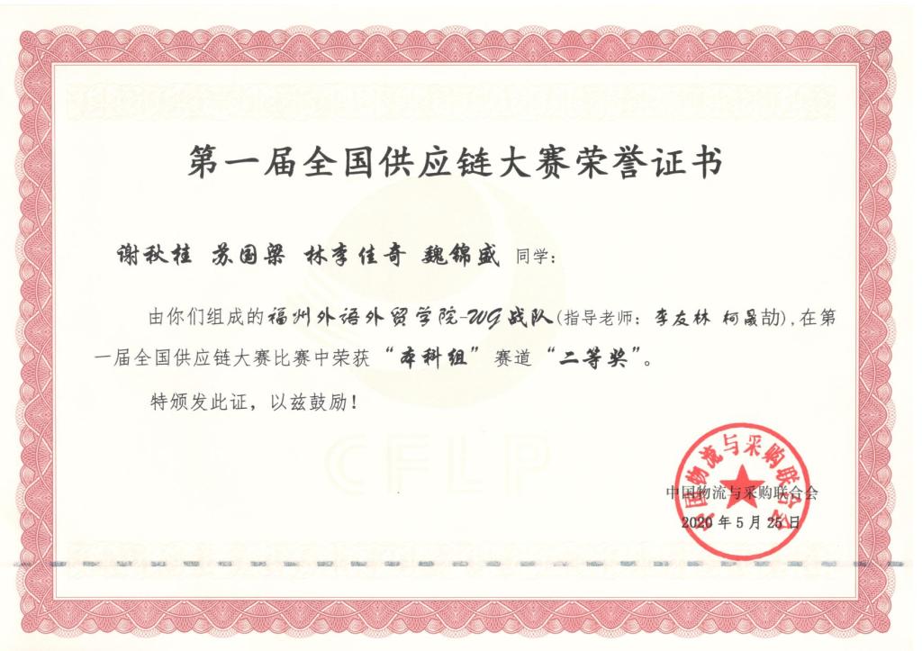 第一届全国供应链大赛全国二等奖(2020年)