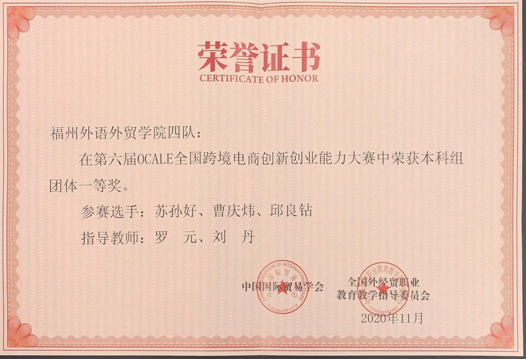 第六届OCALE全国跨境电商创新创业能力大赛全国一等奖2项、二等奖4项(团体)(2020年)