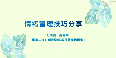 6月9日下午,我校校级教师教学培训师游容华副教授开展了题为《情绪管理技巧分享》的主题沙龙活动。活动采用了腾讯课堂直播的方式,近50位感兴趣的教师参加了活动。