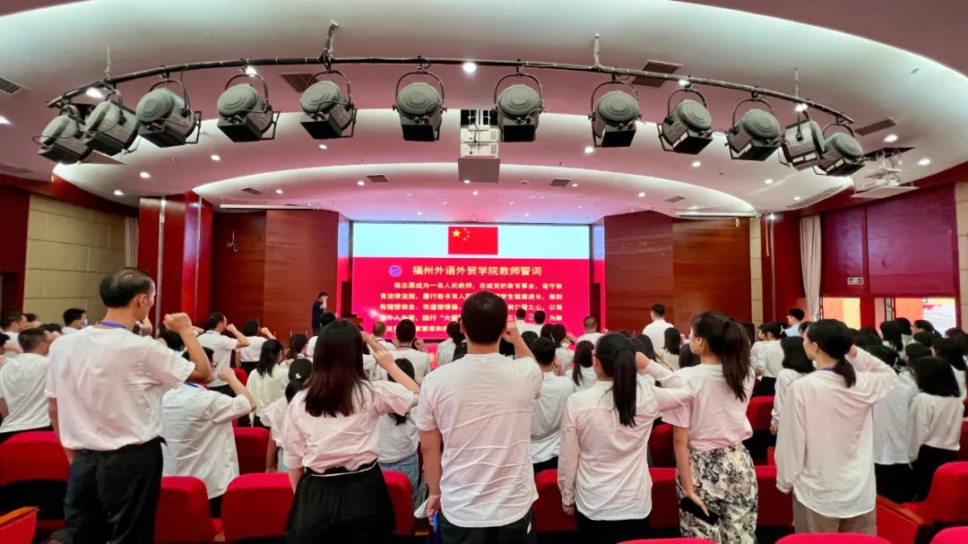 仪式上还进行了新教职工教师宣誓、佩戴校徽、签署《福州外语外贸学院教师师德师风承诺书》等相关活动。教师发展中心负责同志,以及本年度入职的新教职工等120余人参加了活动。