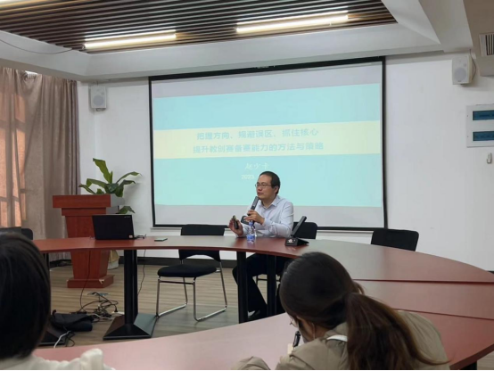 本次培训邀请了福建技术师范学院大数据与人工智能学院副院长赵少卡副教授作主讲人。赵教授以“把握方向,规避误区,抓住核心以提升教创赛备赛能力”为题,对教学创新大赛进行简单介绍,阐述为何要进行教学创新,从课堂实录教学设计、创新成果报告撰写、教学设计创新汇报的误区与建议三个方面进行了深入细致的讲解,将教学竞赛与日常教学进行对比,并结合自己的评审和指导经验从如何设计好一节课教案并做好课堂实录、如何撰写高质量的创新成果报告、如何做好教学创新设计现场汇报等方面进行指导和交流。