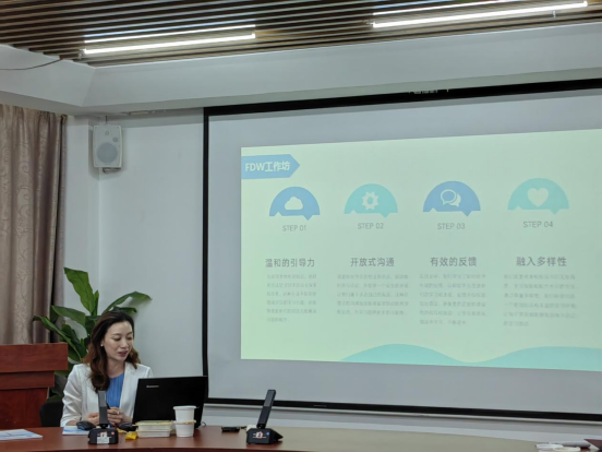 在交流分享过程中,杨俊惠老师从认知了解FDW工作坊、明确目标、精细执行以及总结复盘四个方面向大家分享了FDW教学技能引导员工作坊学习期间的所见所闻。主要介绍了FDW整体工作流程、FDW引导员职责,并在此基础上总结复盘梳理了FDW学习心得。作为ISW教学技能工作坊的进阶学习,FDW培训学习主要培养引导员顺利完成ISW组织、主持和引导工作的能力,以温和的引导力、开放式沟通、有效反馈、融入多样性,营造包容开放、丰富多彩的学习氛围。