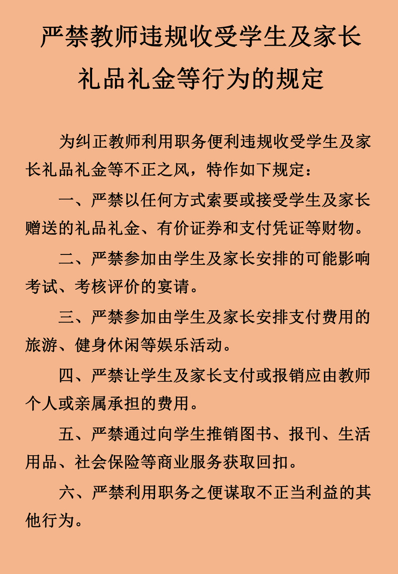 贪污、挪用公款是不可逾越的红线,以下“严禁违规收受学生及家长礼品礼金等行为”的规定也提醒广大教师注意。