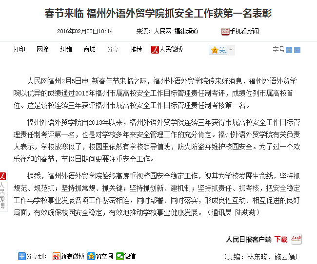 人民网报道:福州外语外贸学院抓安全工作获第一名表彰
