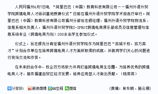 人民网报道:阿里巴巴跨境电商人才培训基地落户福...