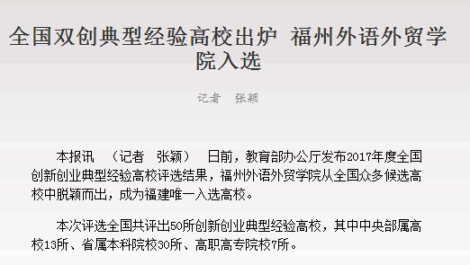 福建日报报道:全国双创典型经验高校出炉 福州外语...