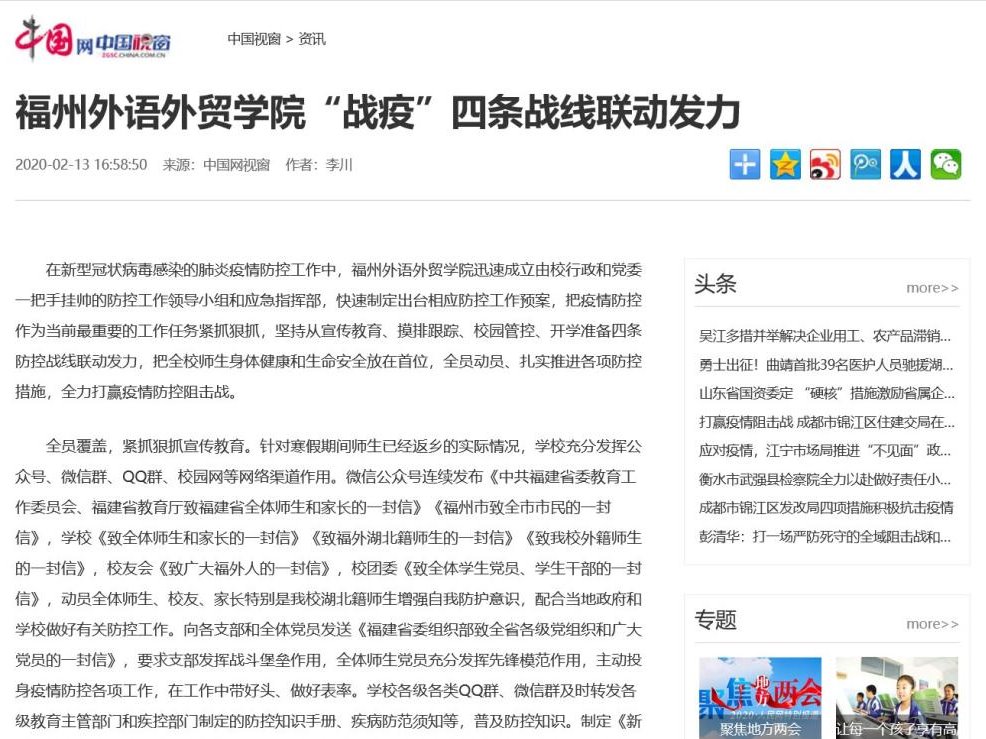 中国网中国视窗报道:福州外语外贸学院“战疫”四...