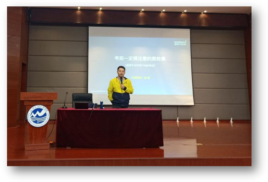 3月12日,外国语学院举办英语专业四级考前培训会,培训会由新东方名师徐宸主讲,2017级英语翻译全体同学参与了本次活动。 徐宸老师向大家说明了英语专业四级考试的重要性和特殊性,并就专业四级考试的题型和学...