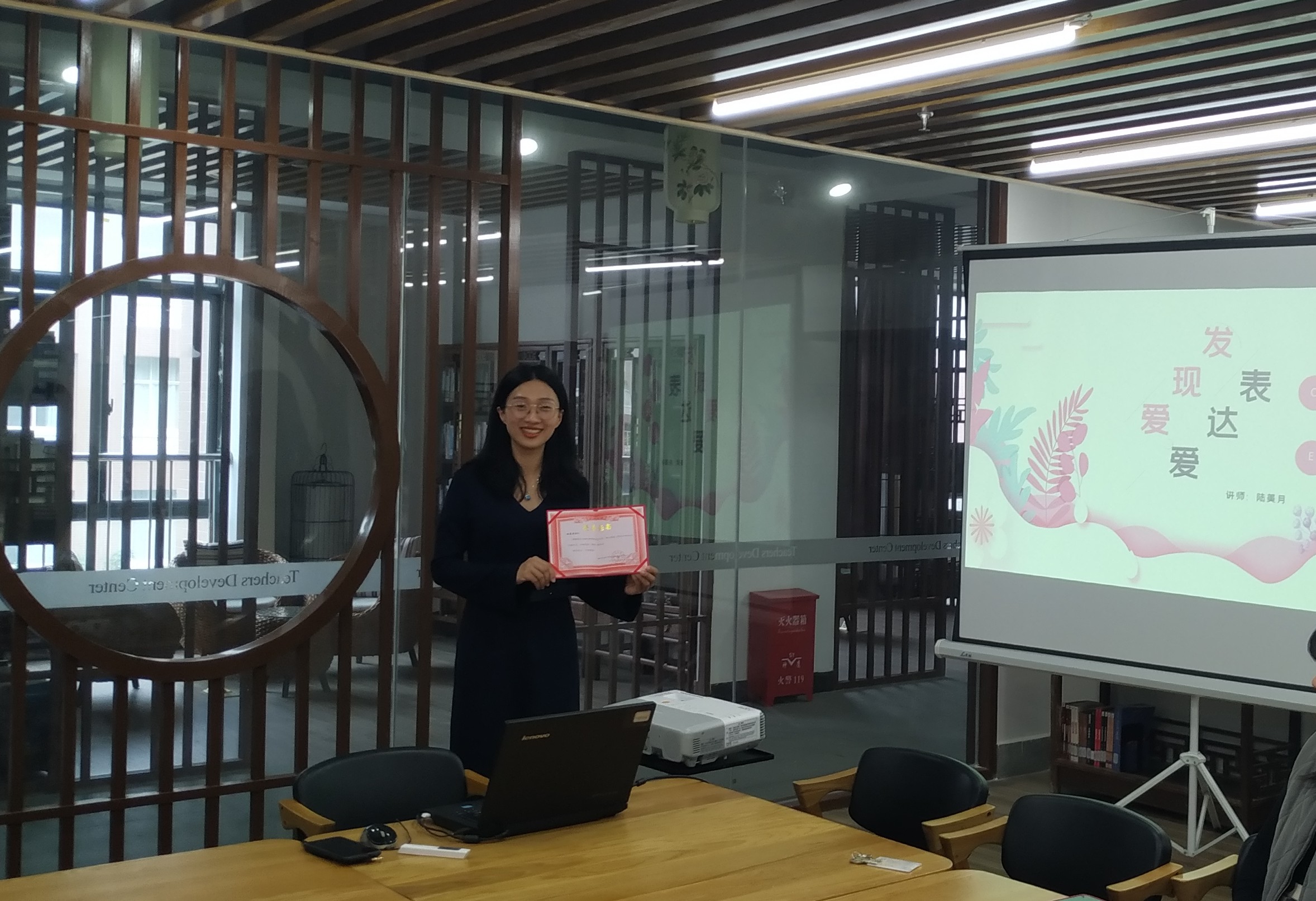 11月26日,教师发展中心邀请学生发展中心二级心理咨询师陆美月作为第三期悦读会分享人,作题为《爱的五种语言》主题沙龙,并为陆美月颁发了“悦读会主讲人”荣誉证书。 陆美月以深入浅出的讲解方式与诙谐幽默...