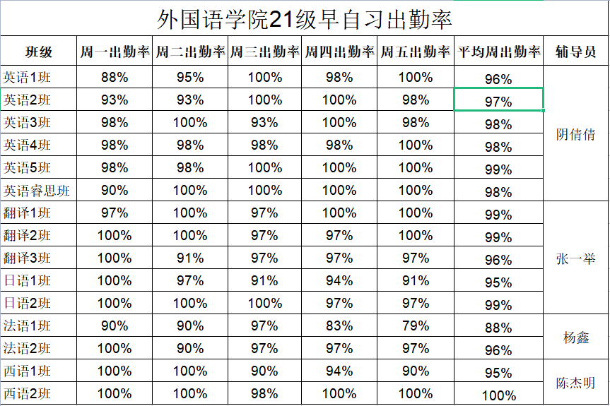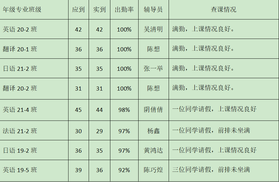 以下是本周抽查的部分班级出勤率,大多数班级都表现良好,座位坐的较零散,希望同学们要高度重视,规范日常的学习行为,养成良好的学习习惯,重视课堂学习,共建文明课堂!