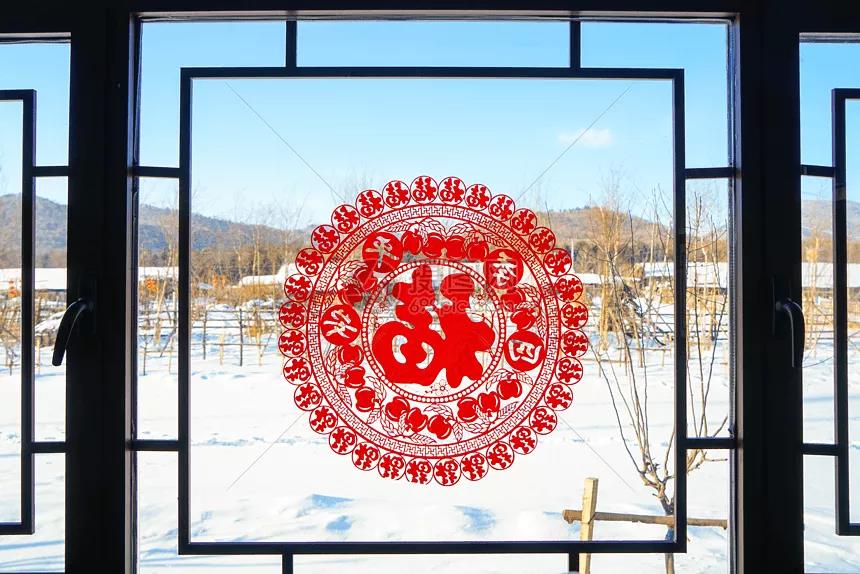 剪贴窗花是北方盛行的民俗活动。窗花图案一般有喜鹊登梅、孔雀戏牡丹 、狮子滚绣球 、三羊(阳)开泰、二龙戏珠、鸳鸯戏水等等。贴上窗花寓意着新的一年越越好。