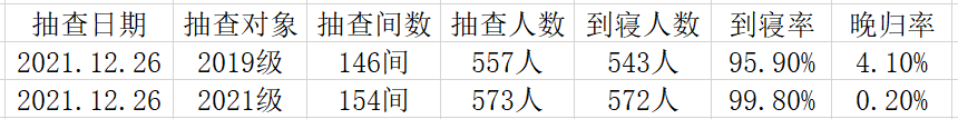 本周存在到寝率不足百分百现象,已及时对晚归人员进行核对确认。在抽查过程中,未发现宿舍楼内有抽烟、酗酒、打架、自炊、赌博、损坏公物、留宿异性、私拉电线等违章违纪现象,楼内公共设施、安全防火等情况良好。