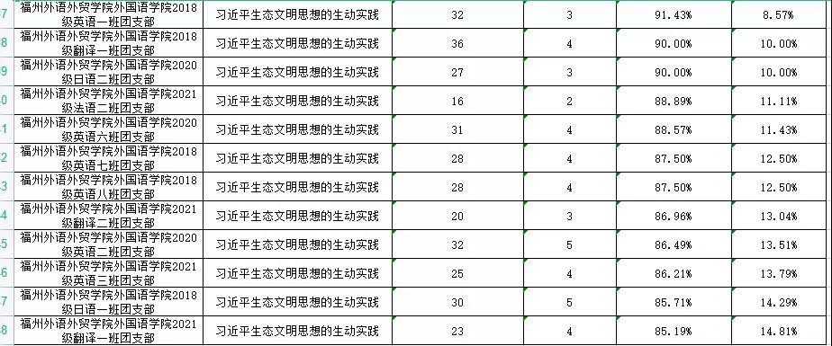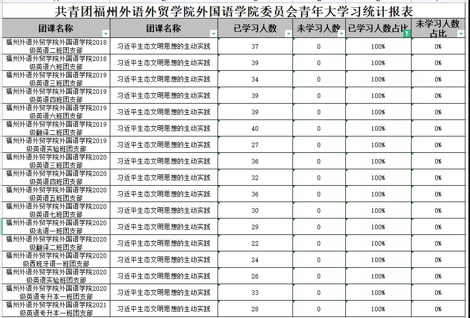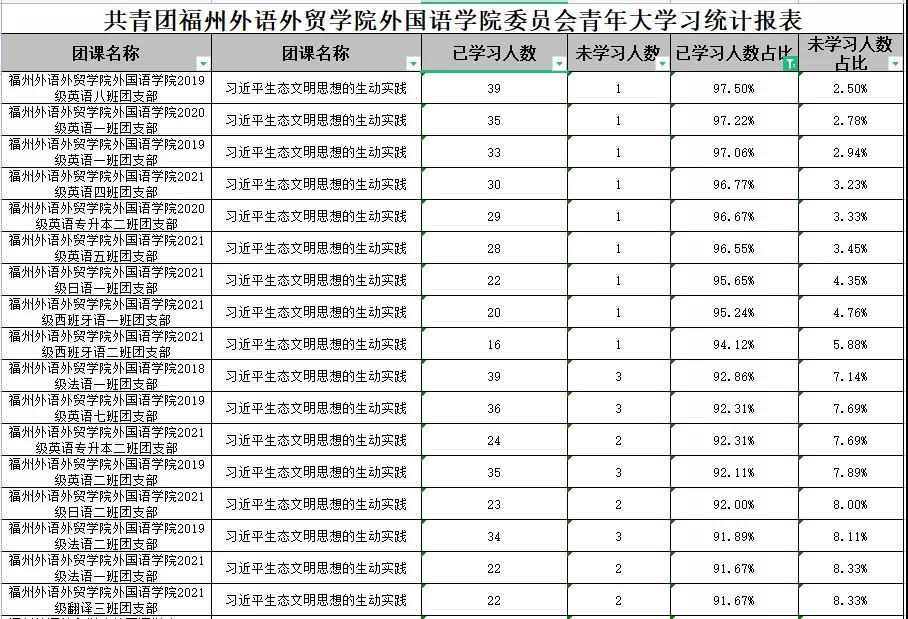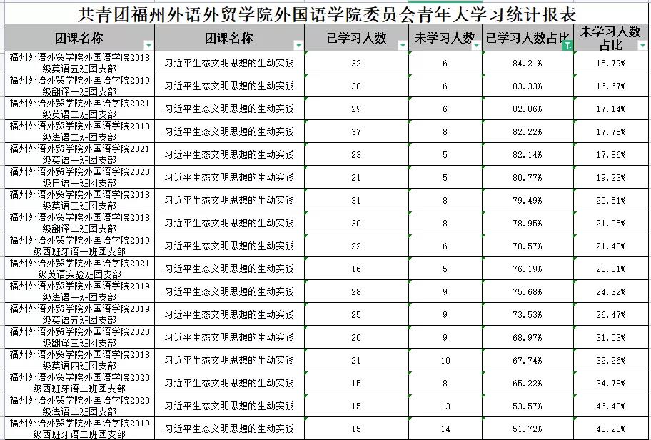 在过去一周里,外国语学院共有1819人次团员青年参加了“青年大学习”第十二季第九期的网上主题团课学习,让我们来看看各团支部团员青年参加学习的具体情况吧!