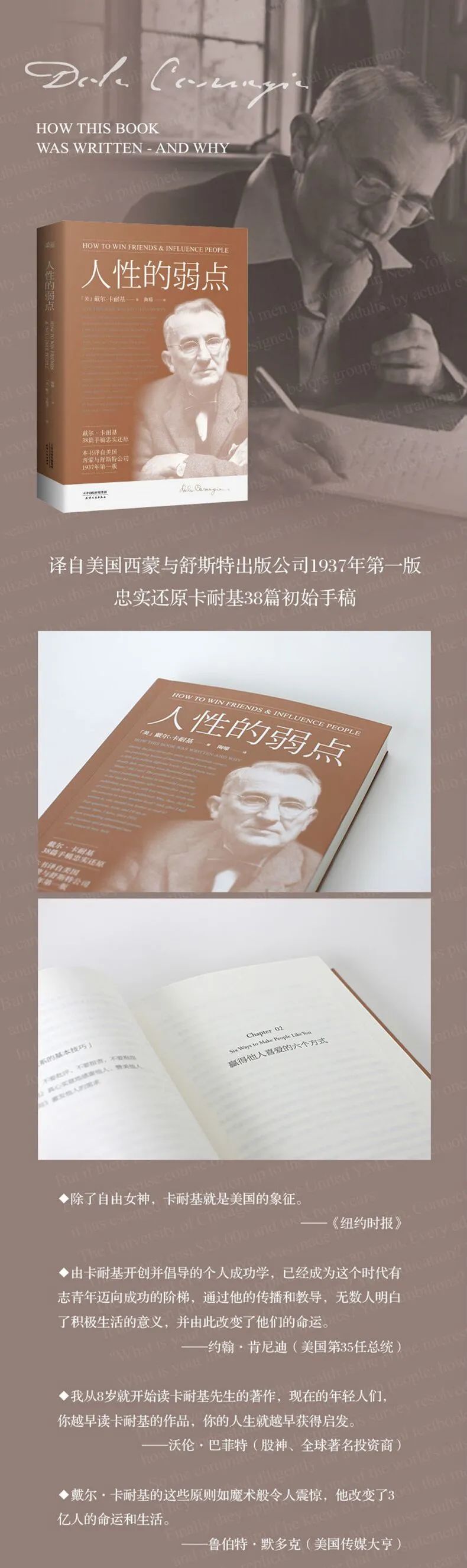 戴尔·卡耐基(Dale Carnegie,1888-1955年),20世纪最伟大的心灵导师,美国现代成人教育之父,美国人戴尔·卡耐基利用大量普通人不断努力取得成功的故事,通过演讲和书唤起无数陷入迷惘者的斗志,激励他们取得辉煌的成功。卡耐基在实践的基础上撰写而成的著作,是20世纪最畅销的成功励志经典。卡耐基主要代表作有:《沟通的艺术》、《人性的弱点》、《人性的优点》、《美好的人生》、《快乐的人生》、《伟大的人物》和《人性的光辉》。这些书出版之后,立即风靡全球,先后被译成几十种文字,被誉为"人类出版史上奇迹"。他一生致力于人性问题的研究,运用心理学和社会学知识,对人类共同的心理特点,进行探索和分析,开创并发展出一套独特的融演讲、推销、为人处世、智能开发于一体的成人教育方式。