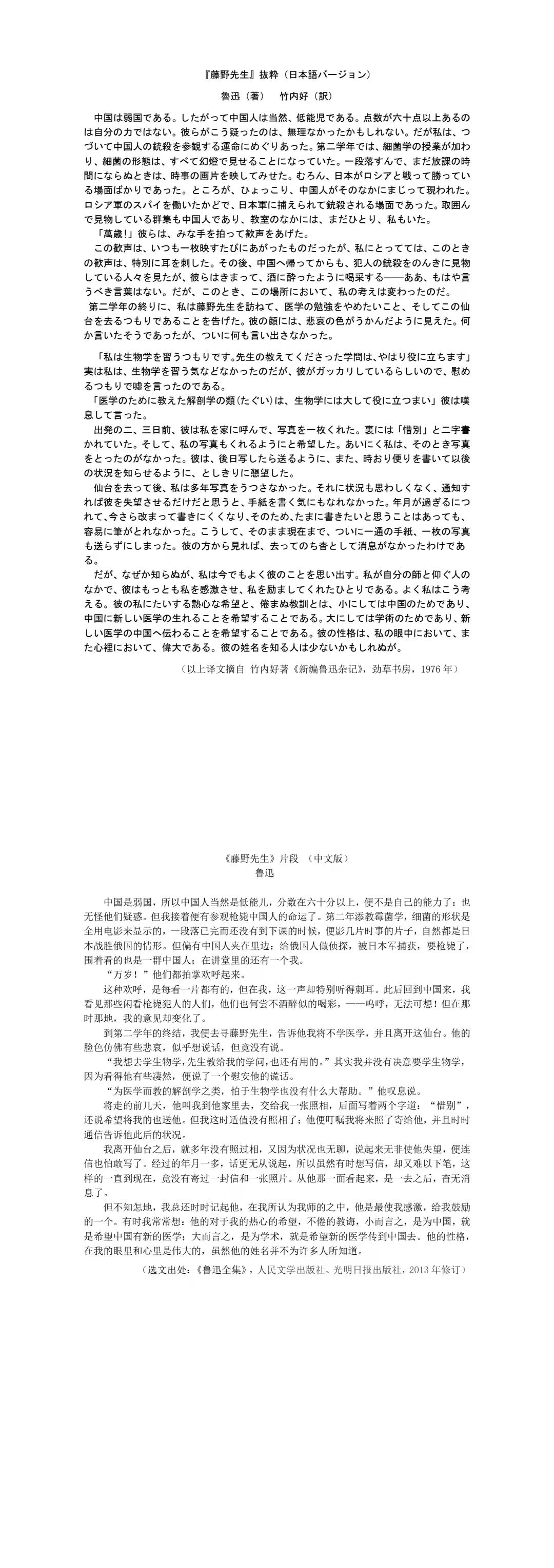 在《藤野先生》中,我们看到了虽身处异国求学,仍心系民族命运,弃医从文的先生。在日本仙台留学时,因课上许多中国人围观同胞被砍头示众的影片却无动于衷,先生痛感欲救人民于水火,扶大厦于将倾,唯有将笔作为武器,唤醒麻木的国人和沉睡的旧中国。以下内容为《藤野先生》片段节选的日文朗读音频和中日文对照。