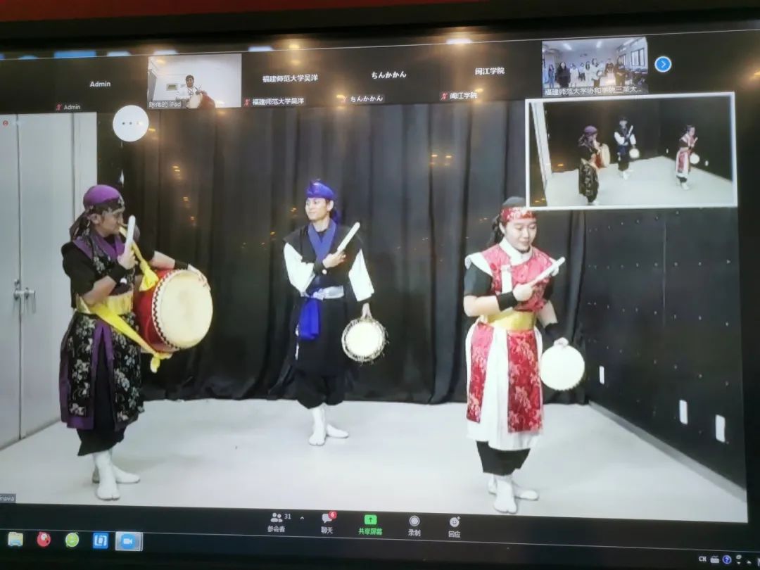 本次交流会采取线上直播的形式进行,来自冲绳的那霸太鼓队为远在中国的福建省各高校太鼓队成员们在镜头前展示了精彩的太鼓表演,并对太鼓动作中的大太鼓,缔太鼓,平眮小鼓等动作进行了的详细讲解,太鼓队的队员以及新入成员就那霸太鼓队的舞蹈动作进行了热烈的讨论与学习。