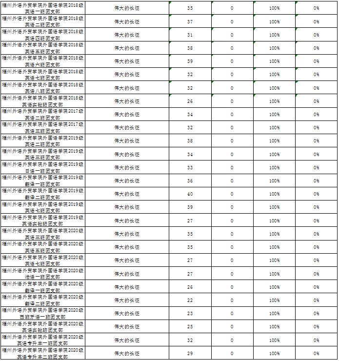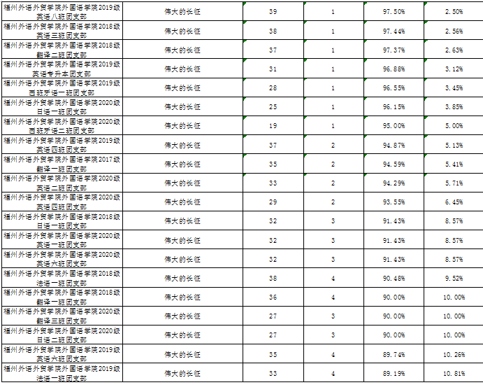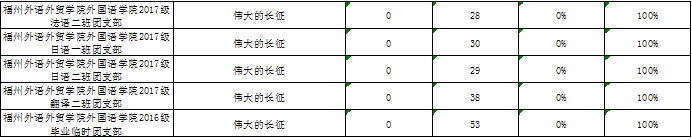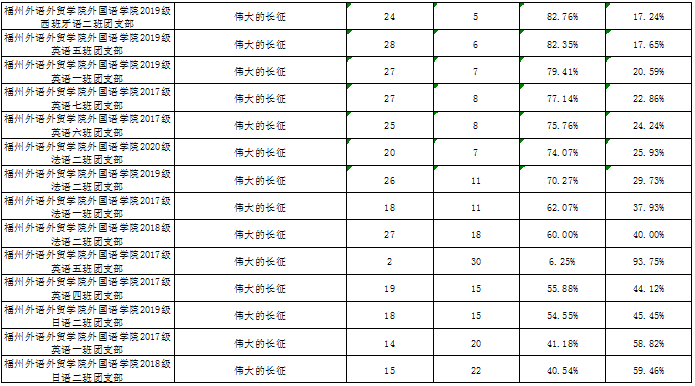 本次主题团课以伟大的长征开展教育。从长征胜利到此刻,已有70年历史,但红军两万五千里长征路仍印刻在后辈人的脑海中。在这来之不易的幸福生活中成长,我们应缅怀革命先烈,用长征精神激励自我,努力学习,为建设现代化社会主义国家做贡献。在本期“伟大的长征”中,外国语学院共有1799人次团员青年参加了本期青年大学习的学习,现在让我们来看看各团支部团员青年参加学习的具体情况吧!完成情况达100%的团支部
