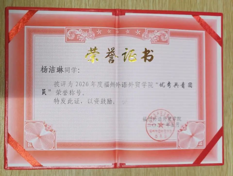 杨洁琳,女,汉族,出生于2001年12月,福州外语外贸学院外国语学院2020级英语专业学生,中共预备党员,担任辅导员助理与班级副班长。