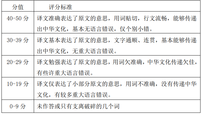 大赛为学习通线上答题比赛。题型分为两个部分,词汇与翻译,所有内容都选自《习近平谈治国理政》第一卷、第二卷以及第三卷。词汇题为客观题,翻译题为主观题,各占50%。翻译题评分标准如下