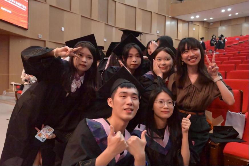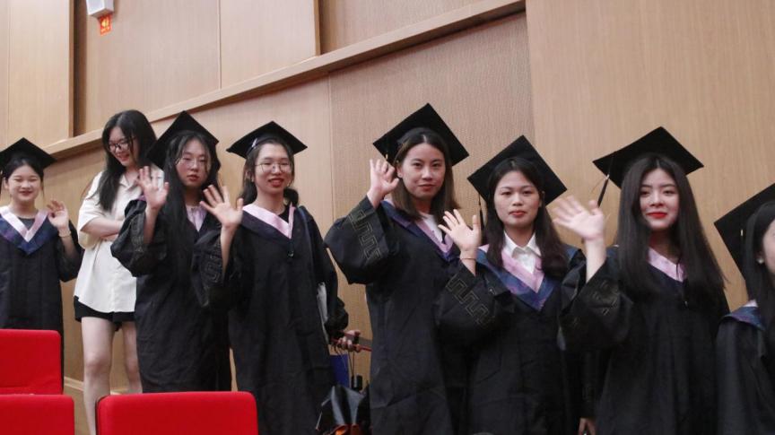 在悠扬的乐曲中,院领导和老师们为现场毕业生们依次正冠拨穗、颁发学位证书、合影留念。