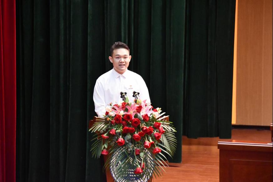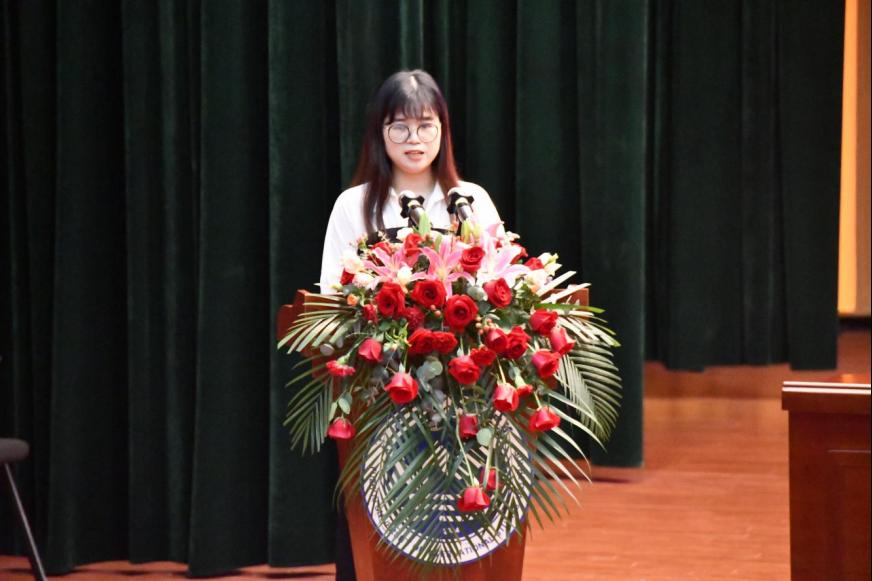 2020级英语专业的李海洋同学代表在校生向毕业生们致以诚挚祝贺和祝福。他表示学长学姐们是校园里生活和学习上的榜样,感谢学长学姐们的关怀与引导,并表示要接过学长学姐们的接力棒,以自己的优异成绩,用自己的实际行动,为母校的发展进步贡献青春和力量!