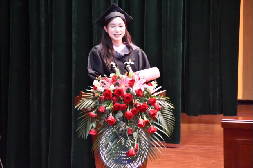 2019级英语睿思英才班潘思辰同学代表2023届毕业生发言,她带领毕业生们重温着一段段难忘的青春回忆,由衷感谢学校的精心培育和师长们的谆谆教诲。她祝愿大家此去有繁花似锦,再相逢依然如故,愿所到之处皆为热土,愿所遇之人皆为良善;她表示自己此后将以梦为马,永远随处可栖,未来心在云天,不坠平生志向。