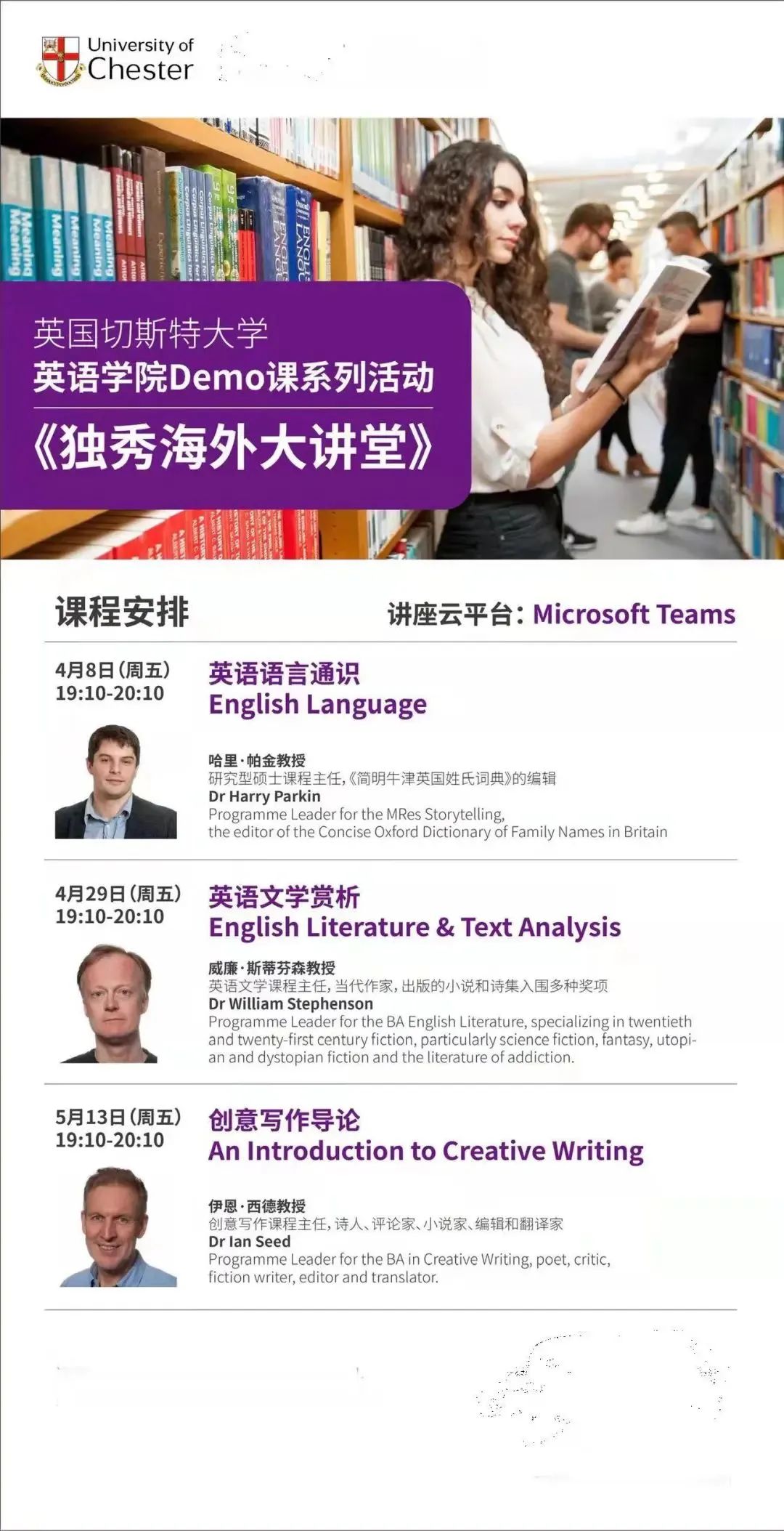 面向对象:英语语言、文学、写作爱好者开讲方式:Teams平台直播 腾讯会议平台直播开讲时长:19:00-20:10 70分钟/每场开讲语言:英语