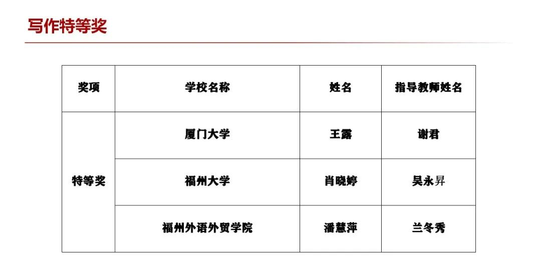 在写作大赛中,2018级英语专业潘慧萍(指导老师:兰冬秀)从全省38所高校169名选手中脱颖而出,与厦门大学、福州大学选手并列荣获福建省特等奖,入围全国总决赛。此外,2018英语专业卢戈梓(指导老师:何君晨)荣获一等奖,2018级英语专业杨昕潼(指导老师:兰冬秀)与2020级法语专业吴栎莹(指导老师:林西锦)皆荣获三等奖。