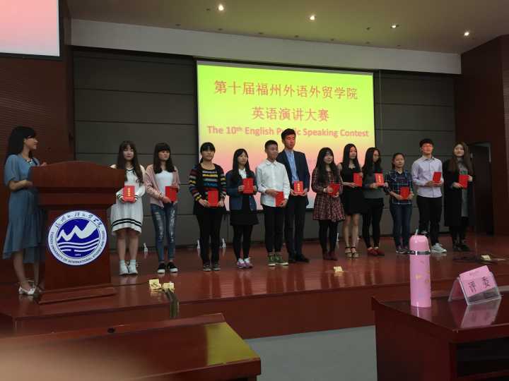4月26日下午,在B楼五楼多功能厅举行全校第十届英语演讲比赛决赛,首先举行的是非英语专业组的决赛,共有12名选手参加了决赛,评委老师由四位中国教师,两位外教组成。决赛流程包括三个部分,首先是选手按照规定的主题进行3分钟的命题演讲,然后参赛者抽取一幅表现某一情景的图画或视频进行口头陈述,最后是参赛者回答评委的现场提问。比赛过程中,12位英语高手PK十分激烈,他们或是洋洋洒洒的演讲,或是声情并茂的发言,或是机智诙谐的回答,让在座的师生们感受到了福外学子的英语魅力。最后,14级国贸对法1班的周婵婵同学夺得了非英语专业组的一等奖,两名选手获得二等奖,四名选手获得三等奖,其余五名选手获得优胜奖。