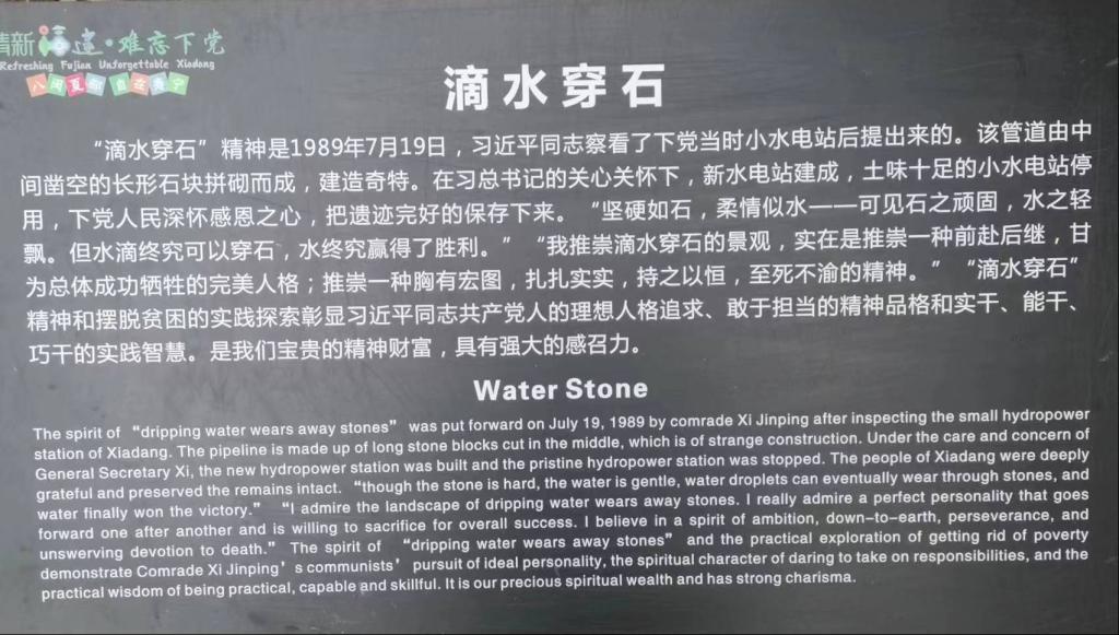 1988年6月至1990年4月,习近平总书记在宁德工作期间,以深入调研起步,建立“四下基层”制度,提出“弱鸟先飞”理念,倡导“滴水穿石”精神,把工作重心放在改善宁德基础设施和人民生活水平上。“滴水石穿”正是下党新型水电站建立后提出,滴水可以穿石,滴水可以见阳光,滴水也可以见希望,秉着“滴水穿石”的精神,下党人民勤勤恳恳,努力奋斗,打造一个焕然一新的下党乡。