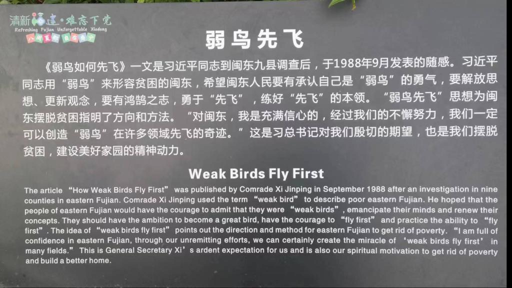 在宁德期间,习近平总书记用脚步丈量闽东的山海川岛,关心和思考着如何“摆脱贫困”。今天,宁德人民实现农村建档立卡贫困户全部清零,曾经的“弱鸟”羽翼渐丰,经济发展呈现“稳中有进、领跑全省”的良好态势。所谓“弱鸟先飞”就是如此,尽管不具备先天地理优势,但下党人民不惧困难,奋发拼搏,带着习总书记的希望,开创了一条属于下党的路,一条属于自己的路。“弱鸟先飞”的本质不在于“弱”,而是要有“先”的勇气,“弱”并不能阻止飞翔,在“先”的加持下,振翅高飞,翱翔凌空。“大鹏一日同风起,扶摇直上九万里”弱鸟终会成为雄鹰,去看那繁花盛开的盛景,飞往更为辽阔的苍穹。