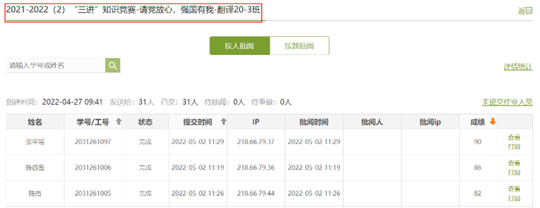 4月27日。王岩老师通过学习通线上组织了2020级翻译3班开展主题为“请党放心,强国有我”的“三进”知识竞赛活动,竞赛题目主要以英汉互译的形式。同学们全程聚精会神作答,在此次竞赛中都取得了不错的成绩。成绩不仅仅是数字,更重要的是在这数字的背后,彰显了新时代的后浪们不再是两耳不闻窗外事,而是将自己的未来与祖国的未来同频同向。