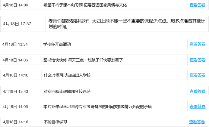 通过问卷调查形式了解了同学们对于专业培养目标、课程设置、校园学习和生活的意见和建议。同学们纷纷填写表格,各抒己见,提出自己的想法。此次调研让班导师对同学们的学习生活以及专业学习上的想法有了更加深入的了解,根据同学们的意见和建议进行调整和改善,力求将本专业的教学教育做得更好。