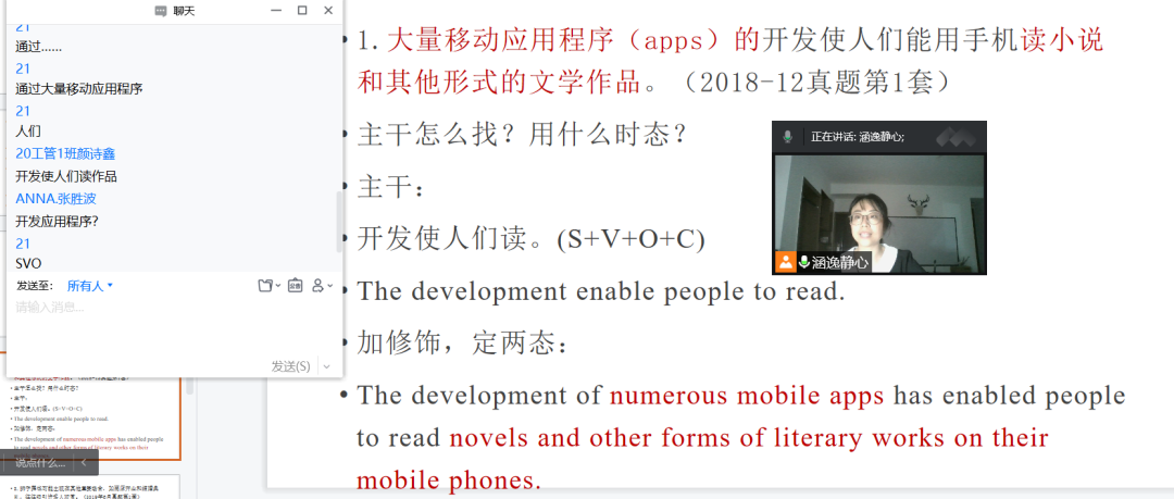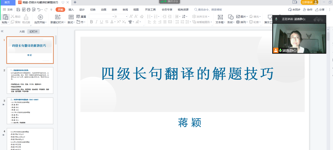 为迎接即将到来的大学英语四级考试,指导同学们更好地迎考、备考,2022年4月26日,外国语学院公共外语教研部蒋颖老师在腾讯会议开设题为“四级长难句的解题技巧”的专题讲座,吸引了各专业的众多学生前来听讲。