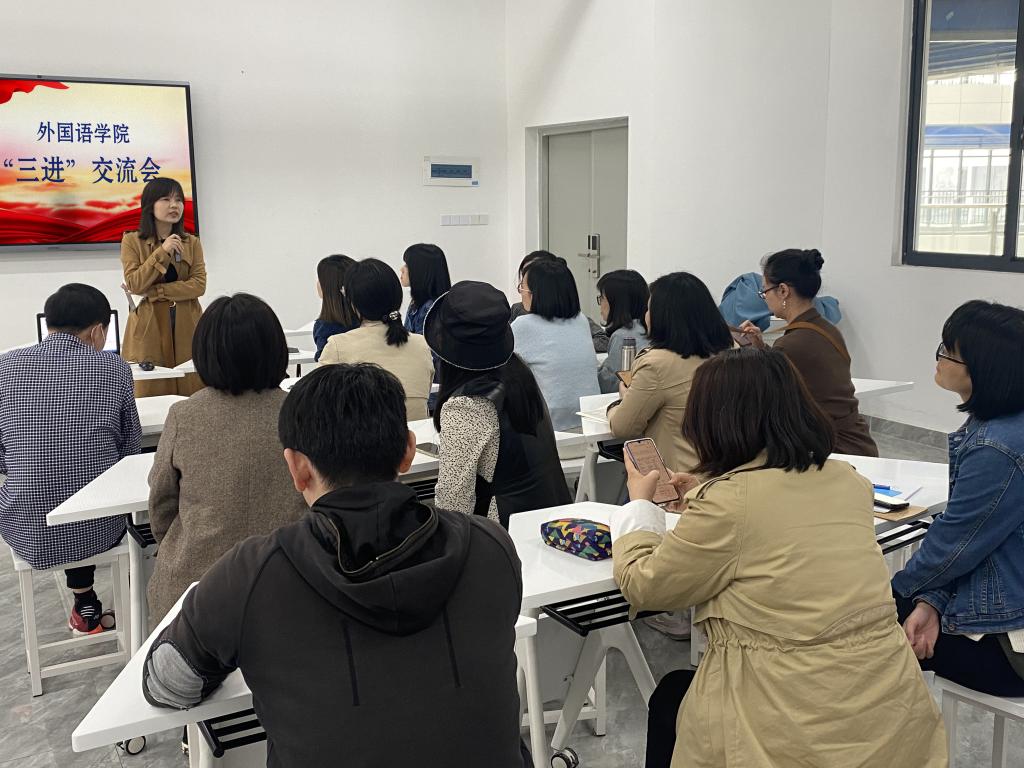 为贯彻落实《习近平谈治国理政》“三进”工作,将习近平新时代中国特色社会主义思想融入我校大学外语教学研究和人才培养全过程,促进我院教学高质量发展,加强教师交流,提升教学质量,公共外语教学部于4月19日下午在人文楼3-203召开大学英语“三进”汇报暨教师期中座谈会,本次会议由系主任吴菲娜老师主持,所有公共外语教学部教师参与。