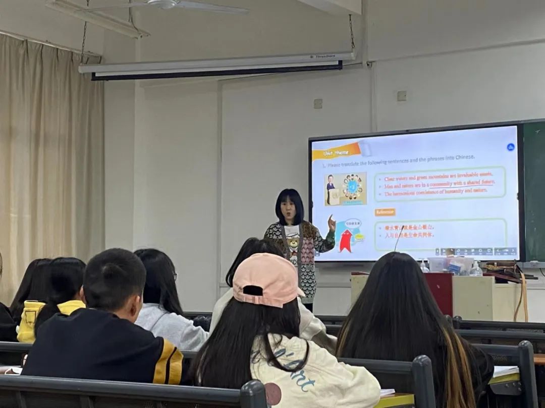 本次主讲内容为《大学英语(四)》第四单元,以Nature(自然)为主题,将“绿水青山就是金山银山”、“人与自然是生命共同体”、“人与自然和谐共生”等理念自然融入到教学中,利用智慧教室的希沃白板与超星学习通等方式与学生热烈互动,学生积极参与课堂讨论,对本单元主题与问题讨论各抒己见,课堂氛围活跃,教学效果良好。