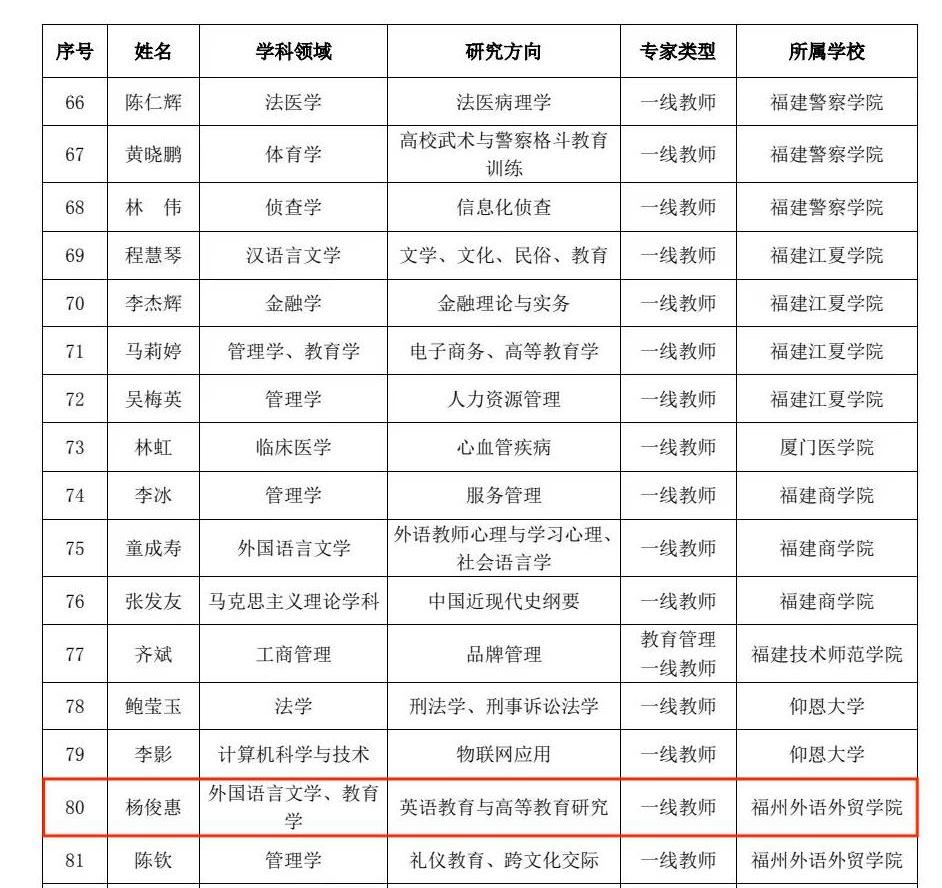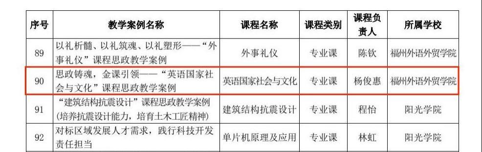 近日,福建省高校课程思政教育联盟公布福建省课程思政专家库建设及优秀教学案例征集活动入选名单,我院教师杨俊惠副教授入选省课程思政专家库,其教学案例《思政铸魂,金课引领——“英语国家社会与文化”课程思政教学案例》入选省课程思政优秀教学案例。