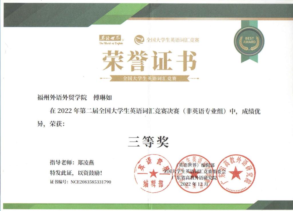 日前,2022年第二届全国大学生英语词汇竞赛决赛公布比赛结果。我院学子与北京大学、复旦大学、武汉大学等1800多所高校学子同台竞技,经过激烈竞争,我院学子在英语专业组和非英语专业组的比赛中均荣获佳绩,共获得2项二等奖、3项三等奖。