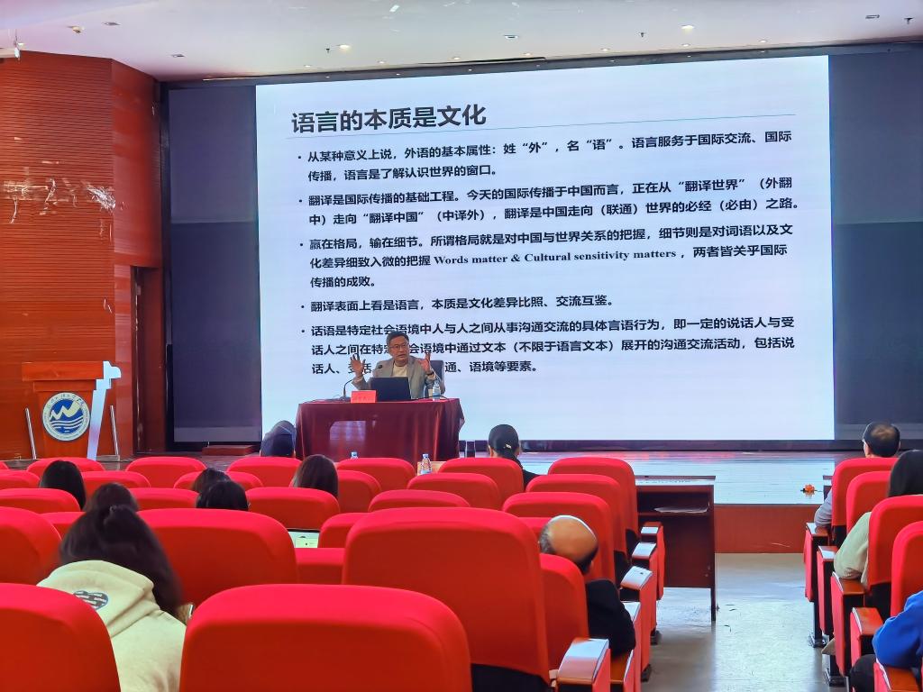 讲座内容分为三个部分。第一部分是国际视野下的中国与世界的比较视野,第二部分是国际传播中语言(外语)的本质,即文化交流、碰撞、互鉴。第三部分是国际传播与对话的可行性探讨。