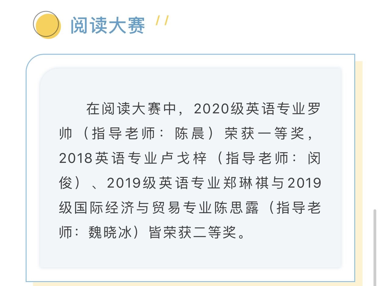 睿思英才实验班学生参加各级各类英语竞赛,屡获佳绩。包括“外研社·国才杯”全国英语演讲大赛福建赛区一等奖,“外研社·国才杯”全国英语阅读大赛福建赛区一等奖,“外研社·国才杯”全国英语写作大赛福建省一等奖,第三届全国高等院校英语能力大赛一等奖,第七届全国学术词汇大赛一等奖,全国大学生英语语法大赛二等奖等。