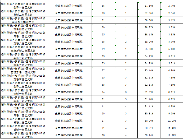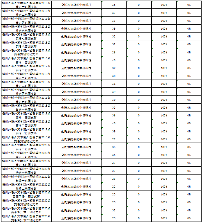 这一次主题团课带大家回忆了全民族抗战的历史,带着全体青年们了解了中国共产党在14年抗战中发挥的重大作用。无数先烈为我们构筑了今天的美好生活,抗战胜利后,我们不断发展。作为当代青年,我们要发扬不屈不挠的精神,努力创造辉煌的未来!在本期“全民族抗战的中流砥柱”中,外国语学院共有1795人次团员青年参加了“青年大学习”第十一季第五期的网上主题团课学习,让我们来看看各团支部团员青年参加学习的具体情况吧!